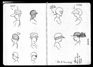 régulièrement le matin avant que la journée commence, attablé à la terrasse de la Brioche de Kipé (filiale guinéenne de la Brioche Dorée) je regarde l’activité d’une grande rue de Conakry, il y a les voitures, de toutes sortes, mais surtout les passants et les taxis moto, leurs pilotes casqués ou non, leurs passagers, un, deux, parfois trois et les objets qu’ils transportent. Je dessine ce qui passe devant moi à des vitesses plus ou moins grandes, les dessins ne disent rien de la vitesse du sujet, le trait est égal que ce soit un passant lent ou un motocycliste pressé. Ce sont les têtes qui m’intéressent et surtout ce qui les couvrent, la variété me fascine, le carnet se remplit, une parenthèse idéale est là, y revenir se poser chaque matin, comme une bulle apaisante au milieu du tumulte.